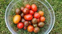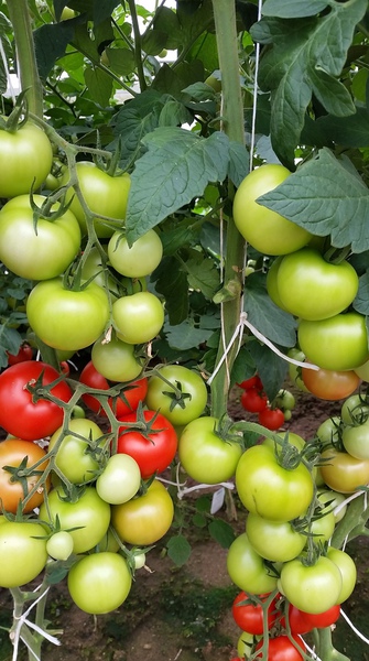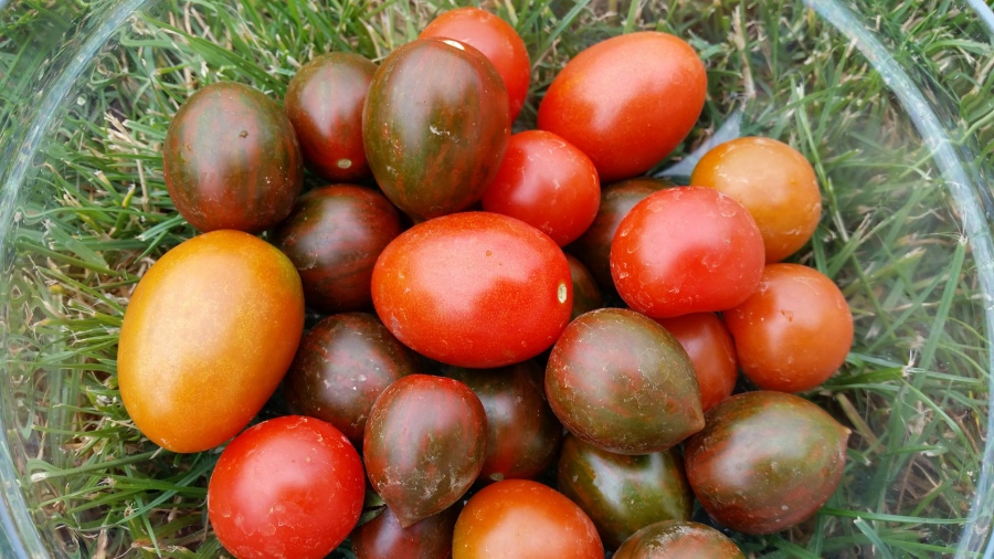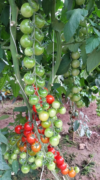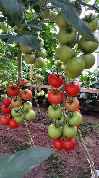 Die Sorten SportivoF1 Geschmackstomate und die kleineren Tomaten mit den langen Trauben ist die Tropical F1 Cocktailtomate.