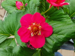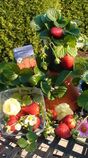 Summer Breeze Rose fällt mit ihren wunderschönen gefüllten rosa Blüten und den roten Erdbeeren voll ins Auge.