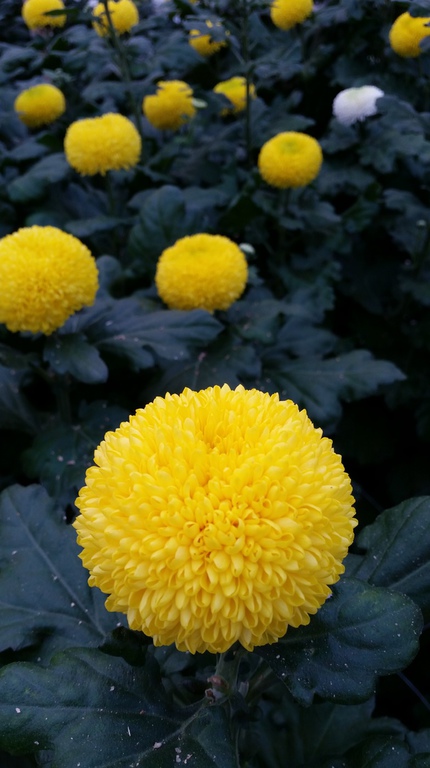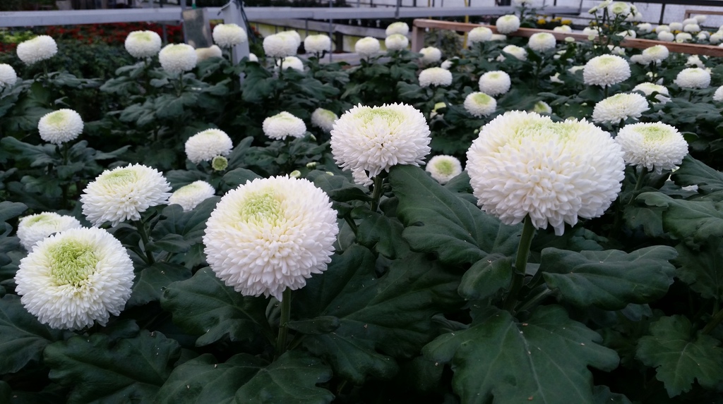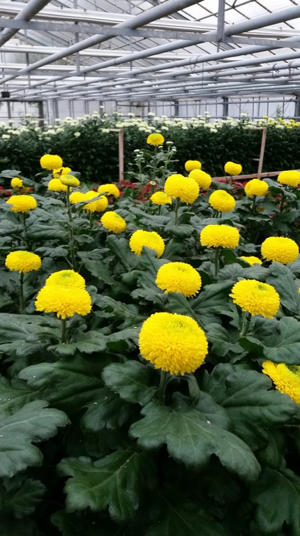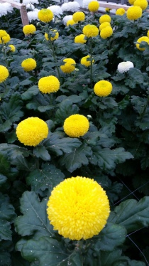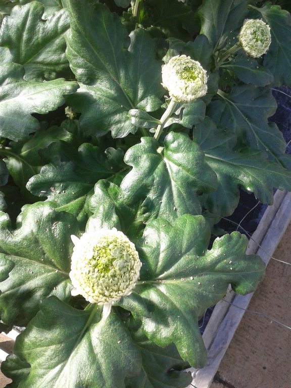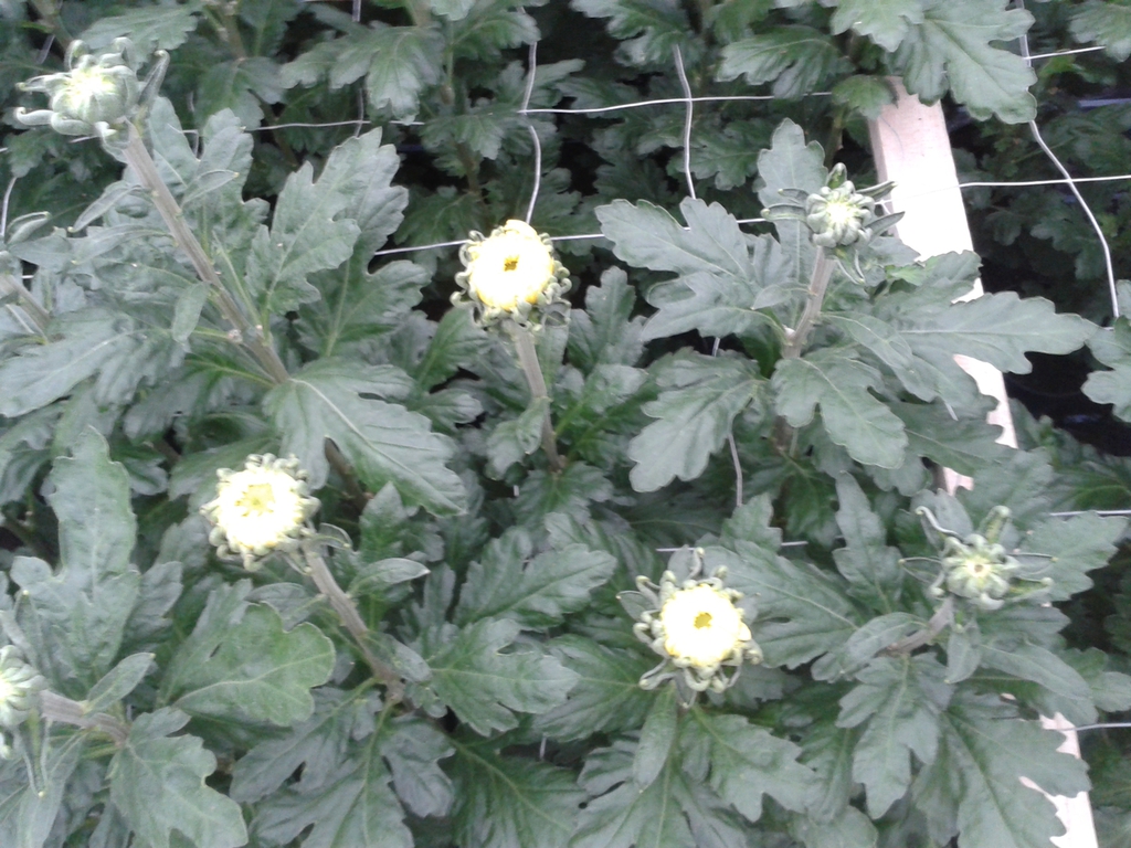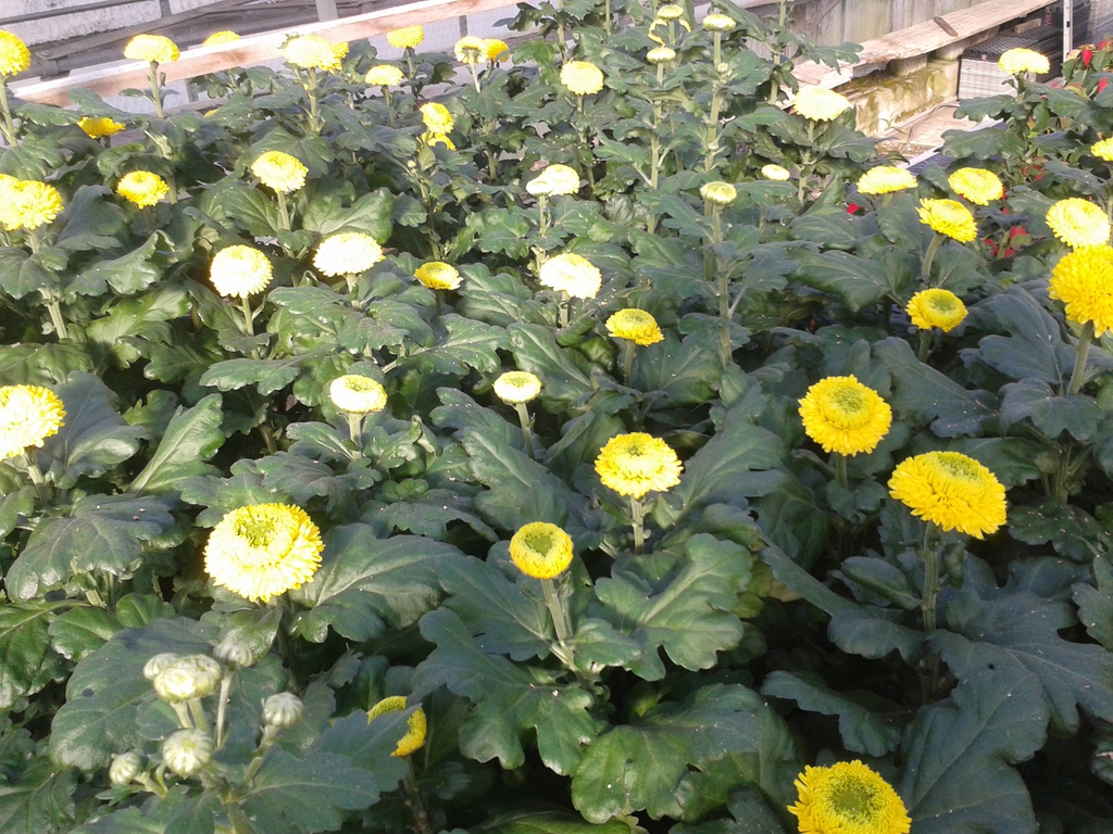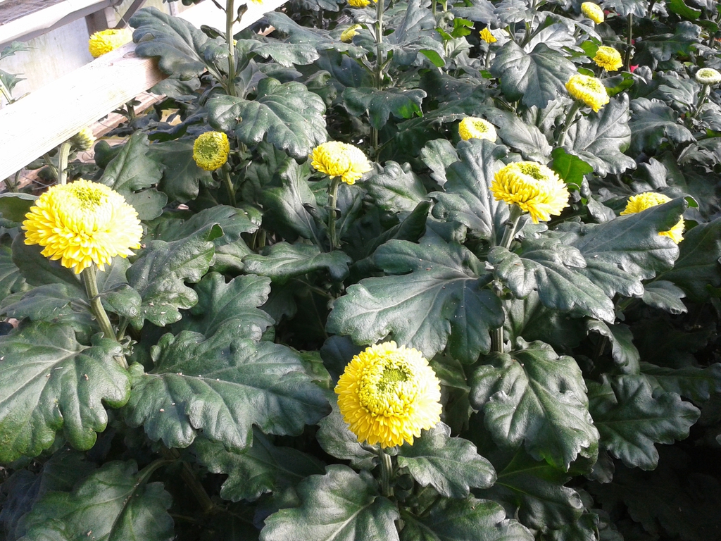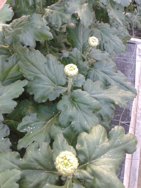 Ich glaube jetzt wissen Sie auch warum die Chrysanthemen Boris Becker heißen. Ja sie schauen halt wie Tennisbälle aus. Sie wissen ja das ist kein Staub oder Dreck auf den Blättern, das sind kleine Sägespäne, die Träger der Nützlinge gegen Schädlinge.